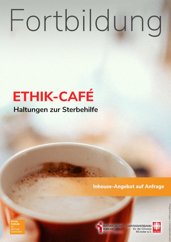 Beim „Ethik-Café“ handelt es um ein innerbetriebliches Fortbildungsformat der moderierten Besprechung von pflege- und medizinethischen Fragen. Mitarbeitende können hier im ungezwungenen kollegialen Austausch und in einem überschaubaren zeitlichen Rahmen sich Rat holen und Rat geben. Die Auseinandersetzung mit aktuellen Fragen zur Sterbehilfe mit dem Schwerpunkt der Suizidassistenz wird erfahrungsbezogen und dialogisch gestaltet.